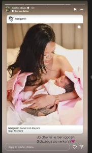 Një ndër ta ishte edhe moderatorja e dashur Einxhel Shkira, e cila nuk e la pa reaguar këtë moment të veçantë. Ajo ripostoi lajmin për lindjen e vajzës së Rihannës dhe, me humor e dashuri, i bëri një “pyetje publike” partnerit të saj, Dagz-it: