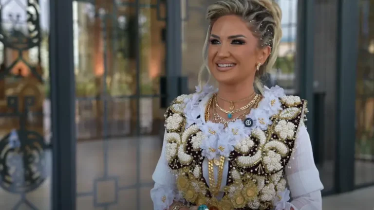 Nusja Engjëllushe duket e kuruar deri në detajin e fundit, e veshur me veshje tradicionale, shkruan Kosovarja. Ajo ka përzgjedhur një ansambël që pasqyron bukurinë e traditave shqiptare, duke e bërë të duket si një figurë nga përrallat, e mbushur me shkëlqim dhe elegancë.