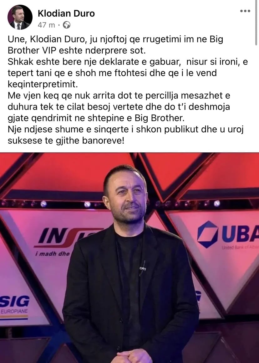 “Unë, Klodian Duro, ju njoftoj që rrugëtimi im në ‘Big Brother VIP’ është ndërprerë sot. Shkak është bërë një deklaratë e gabuar, nisur si ironi, e tepërt tani që e shoh me ftohtësi dhe që i lë vend keqinterpretimit,” shkruan ai.