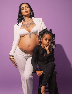 Përveç kësaj, në foto shfaqet edhe vajza e saj e vogël, e cila me një mimikë delikate dhe një veshje të errët, duket se trashëgon bukurinë e nënës. Nënë dhe bijë janë kapur në një moment të ëmbël, që e bën këtë imazh akoma më të veçantë. E gjithë skena është e ndriçuar me një ngjyrë të këndshme purpur, e cila shton ndjenjën e afeksionit dhe ngrohtësisë.