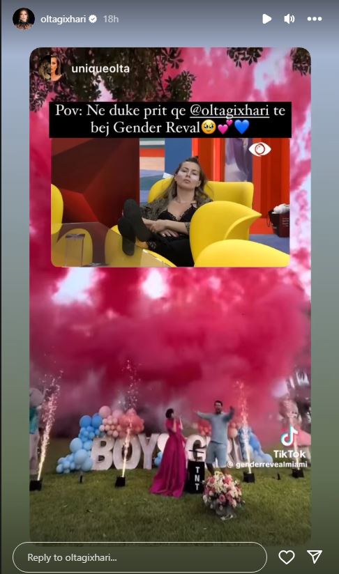 Aktorja ka ripostuar në InstaStory një video të fanses së saj, në festën e “gender reval” ku një çift kanë zbuluar se gjinia është vajzë.