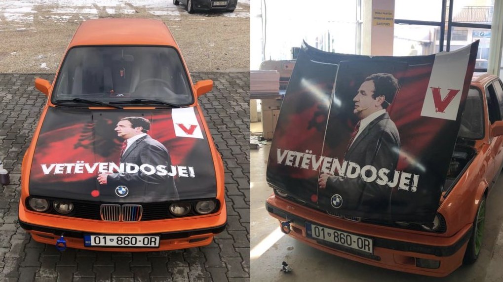 Makinën e tipit “BMW”, ai e ka personalizuar me figurën e kreut të Lëvizjes Vetëvendosje, Albin Kurti.