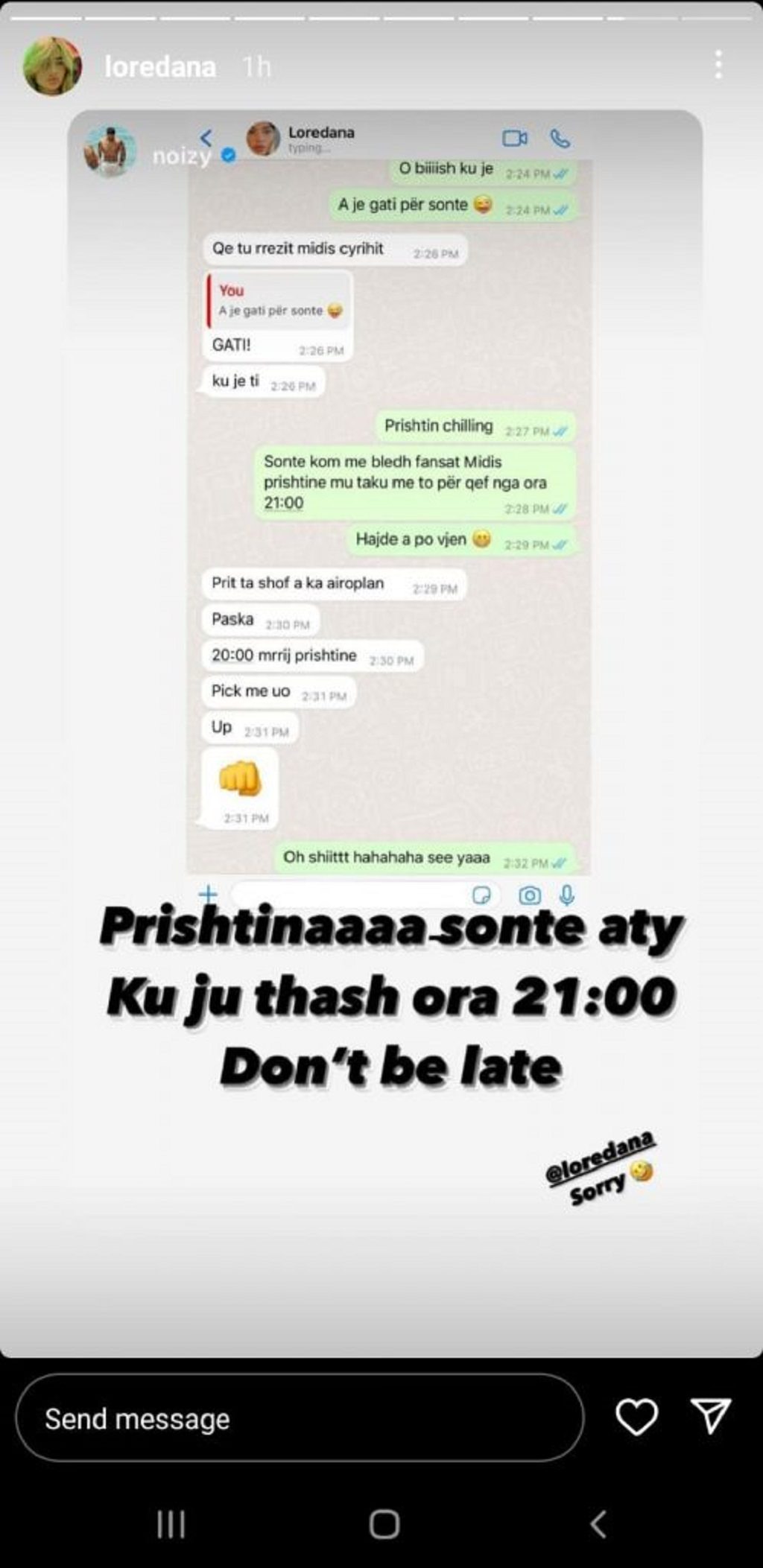 Së fundmi Noizy ka publikuar edhe disa mesazhe private me Loredanën në Whats’app, ku ai e fton reperen të shkojë në Prishtinë për një takim me fansat.