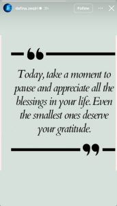 “Sot, merrni një moment për t’u ndalur dhe për të vlerësuar të gjitha bekimet në jetën tuaj. Edhe ato më të voglat e meritojnë mirënjohjen tuaj,” shkroi ajo në Instagram.