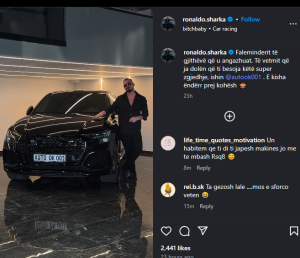 Ronaldo Sharka ka ndarë me ndjekësit në rrjetet sociale blerjen e tij më të fundit: një makinë luksoze Audi RS Q8, vlerësuar me qindra mijëra euro. Me një stil tërheqës dhe një qëndrim plot vetëbesim pranë automjetit, Sharka ka tërhequr menjëherë vëmendjen e publikut.