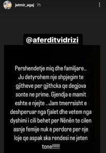 “@aferditvidrizi: Pershendetje miq dhe familjare.. Ju detyrohem nje shpjegim te gjitheve per gjithcka qe degjova sonte ne prime. Gjendja e mamit eshte e njejte ..Jam tmerrsisht e deshperuar nga fjalet dhe vetem nga dyshimi i cili behet per Nënën te cilen asnje femije nuk e perdore per nje loje qe aspak ska rendesi ne jeten tone!!!!!!”