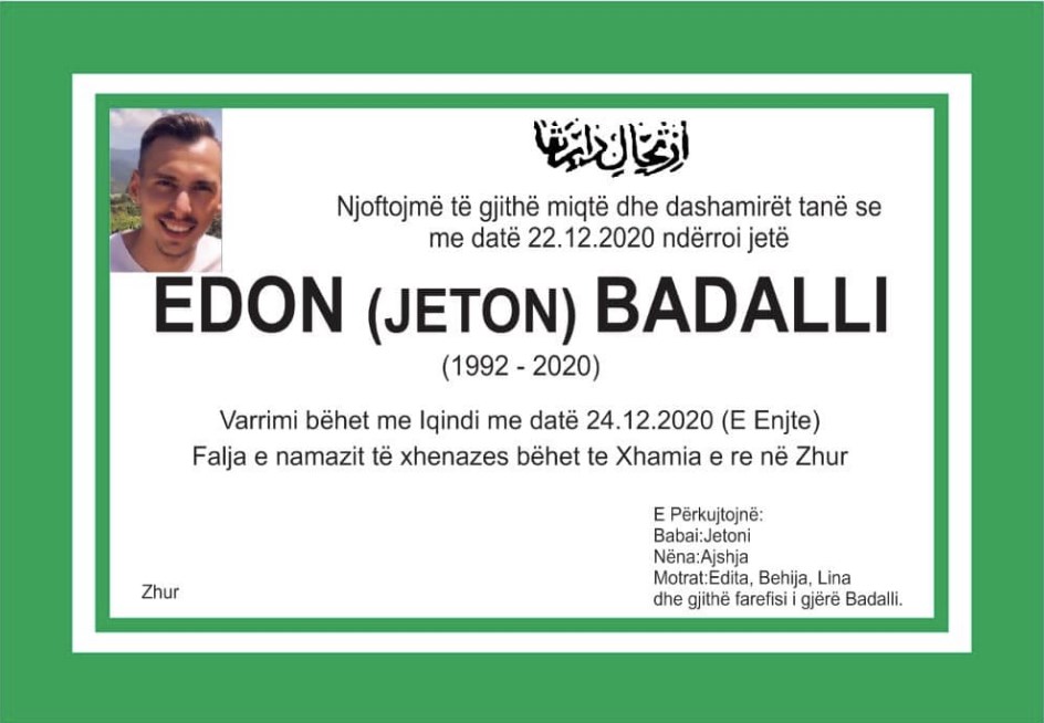 “Me dhimbje më të thellë e më të madhe po i shkruaj këto vargje që më dalin nga shpirti. Ia kushtoj shokut, mikut, e vëllait tim Edon Badalli. U nda nga jeta shumë para kohe duke na lanë të gjithëve me zemra te thyera e kujtimin e tij që do te mbetet mes nesh si një shok i paharrueshëm e i papërsëritshëm për vlerat e tij shoqnore e njerëzore, i edukuar, i urtë, e punëtor si ai e askush tjetër. Me pikëllim te madh i dërgoj ngushëllimet me të thella e të sinqerta familjes së tij për këto dit të vështira e të tmerrshme të kësaj fatkeqësie që na ka ndodhur të gjithëve sepse sot është ditë zie për te gjithë shokë miq e të afërm të gjithë jemi ne zi…U takofshim Nxhenet shok i jem./Kosova24/
