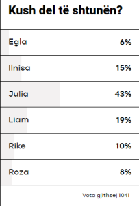 Egla, Ilnisa, Julia, Liam, Rike dhe Roza janë të nominuarit e kësaj jave në Big Brother VIP. Njëri prej tyre do të lërë shtëpinë të shtunën. Votoni në sondazhin e mëposhtëm se cili banor/banore mendoni se do largohet.